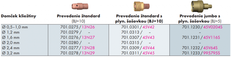 Držiak klieštiny (upínacie púzdro) vhodné pre TIG horáky: ABITIG 9, ABITIG 20, ERGOTIG 9, ERGOTIG 20, ERGOTIG 25, TTK 130 / 130F, TTK 160S, TTK 250WS, TTK 300W, TTC 130 / 130F, TTC 160S, TTC 200W, TTC 250WS, TTG 1200P, TTG 1600P, TTW 2500P, TTW 3000P.